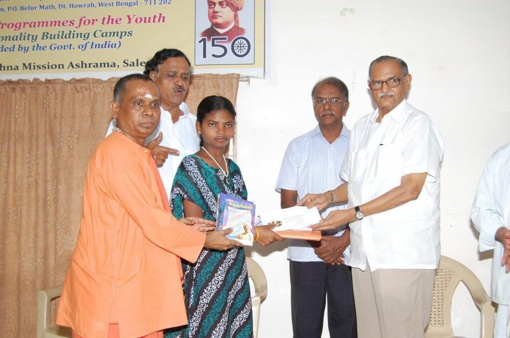 Every year during month of May a cash prize to the Top Scorer of Tamilnadu State Board examinations (SSLC) is being distributed to the Students studying in Rural Govt. Schools in Salem District. In addition to the above, Swami Vivekananda’s lamination and set of Ramakrishna-Vivekananda literature to the school library will also be given.