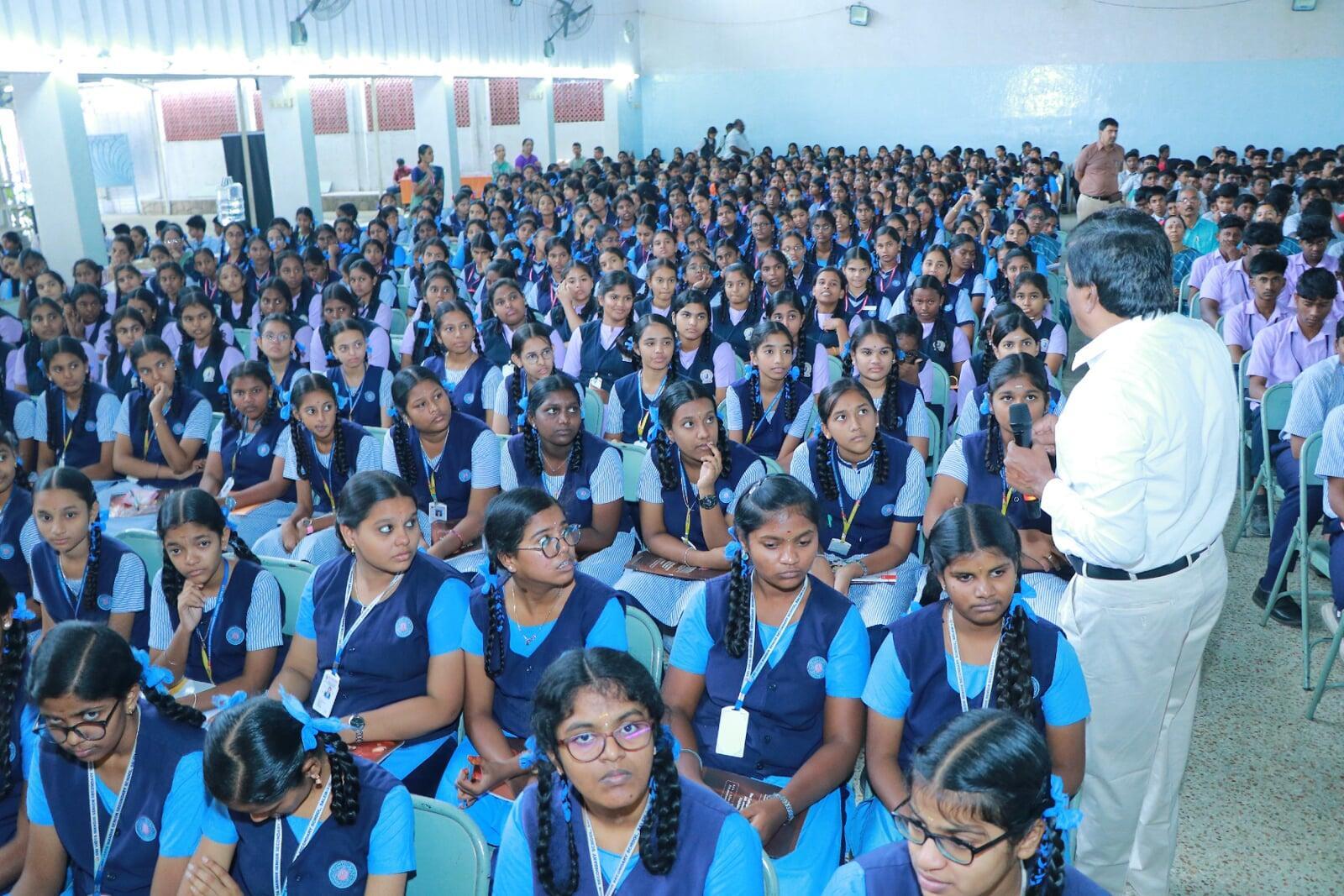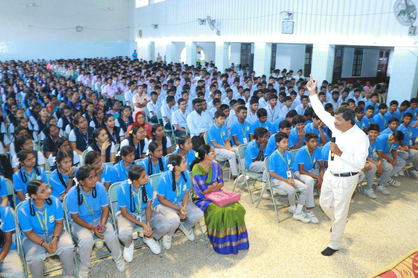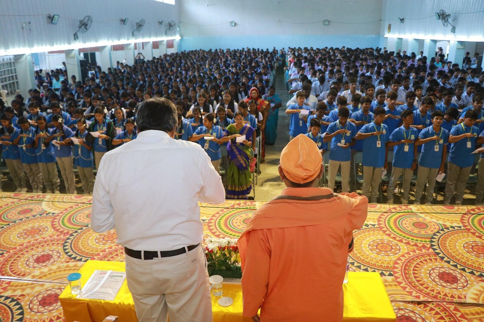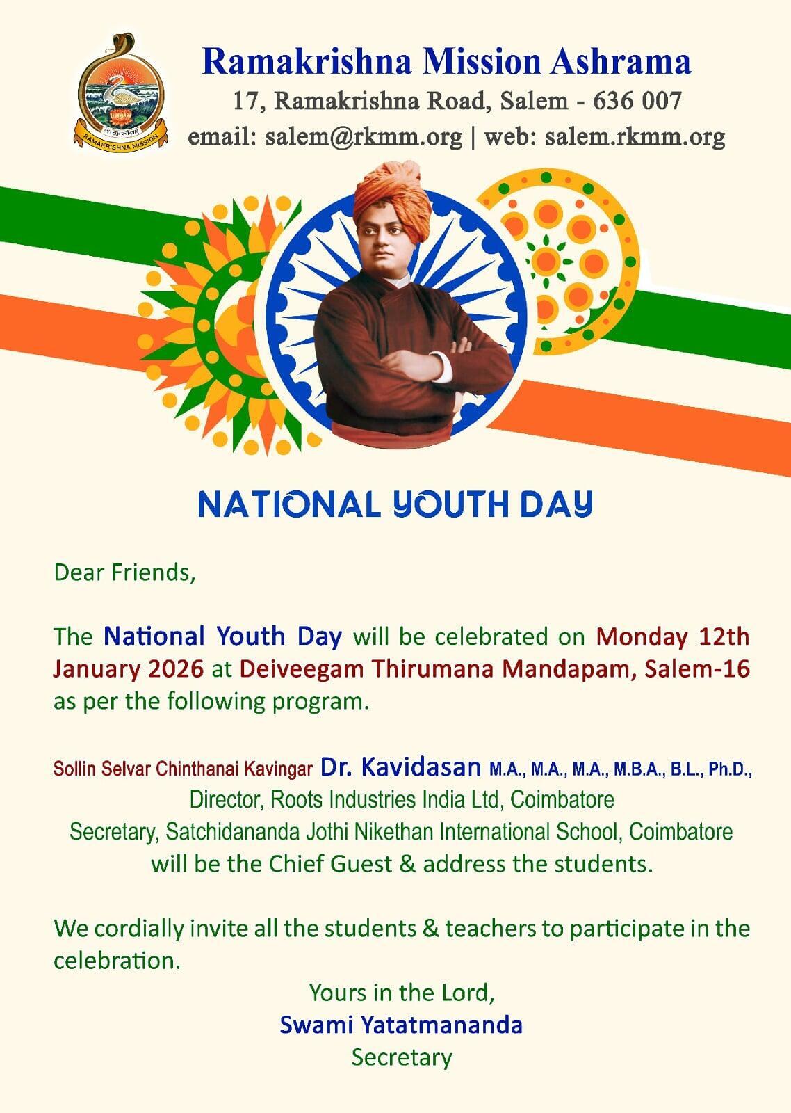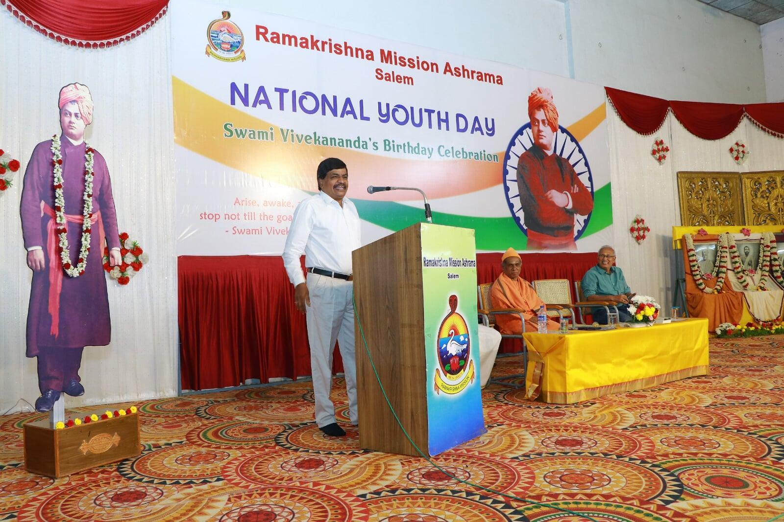 - On 12.1.2026 at Deiveegam Thirumana Mandapam, Salem-16 from 10.00 am to 12.30 pm. Dr. Kavidasan M.A., M.A., M.A., M.B.A., B.L., Ph.D., Director, Roots Industries India Ltd, Coimbatore and Secretary, Satchidananda Jothi Nikethan International School, Coimbatore and Motivational Speaker was the Chief guest and addressed the students on the topic 'Self Confidence is Success'. Sri P.Balu, Ashrama devotee gave a special address on Swamiji. Swami Yatatmananda gave the introduction and welcomed the gathering. Sri Suresha Neelakantan, Ashrama devotee administered the Swadesa Mantra. Total 1100 students attended (including 30 Teachers and 20 volunteers). Swamiji's Book worth Rs.25 were distributed to all the participants. Lunch prasad served to all.